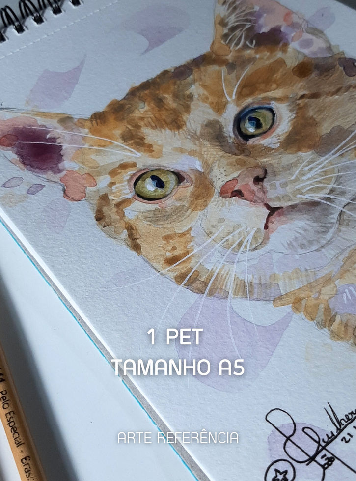 Aquarela de na medida 14,8 x 21 cm, focada no rosto do pet ou retrato devido ao tamanho reduzido, podendo ser na vertical ou horizontal dependendo da foto me encaminhada.